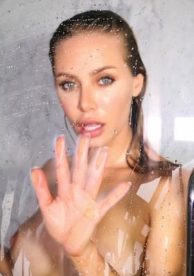 Мокрая женщина ласкает силиконовый груди