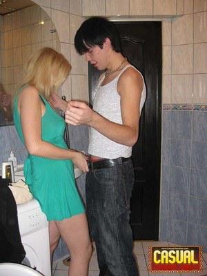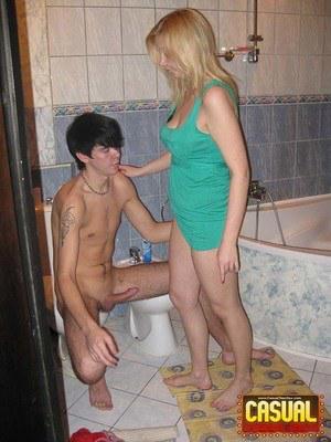 Заскочив в просторную ванную комнату, сестренка в коротком платье стала сексуально двигаться перед братом, который сидел на унитазе. Выяснив что родственница безумно хочет ебаться, брюнет подрочил на барышню ствол, дал отсосать и воткнул пенис между ног.