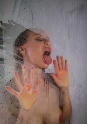 Мокрая любовница прижимается сиськами к стеклу в душевой