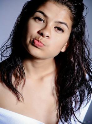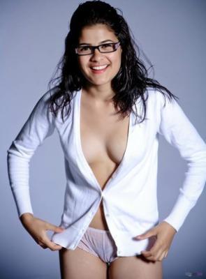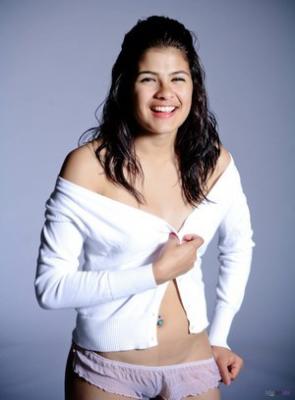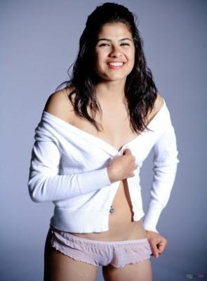 В самый последний момент миниатюрная брюнетка передумала полностью раздеваться и начала прикрывать небольшие титьки короткой белой рубашкой. Успокоившись, стерва в прозрачных трусах высунула короткий язык и начала эротично облизывать скользкие губки.