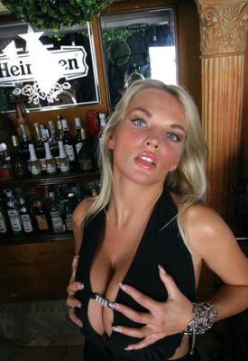 Заглянув в шумный местный бар, телочка в откровенном наряде заказала немалое количество выпивки. Быстро захмелев, русая стерва в коротком платье и черных чулках стала приставать к официанту. Ощупав сиськи, шлюшка с красными щечками дала взглянуть на крупный сосок.