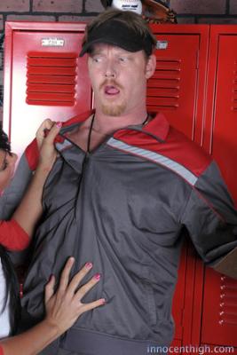 Пробравшись в женскую раздевалку, наглый зрелый уборщик принялся приставать к миниатюрной студентке. Брюнетка в короткой юбке и красных гольфах оказалась не робкого десятка, стерва дала потрогать груди, легла на скамейку и дала вдуть между тощих ног.